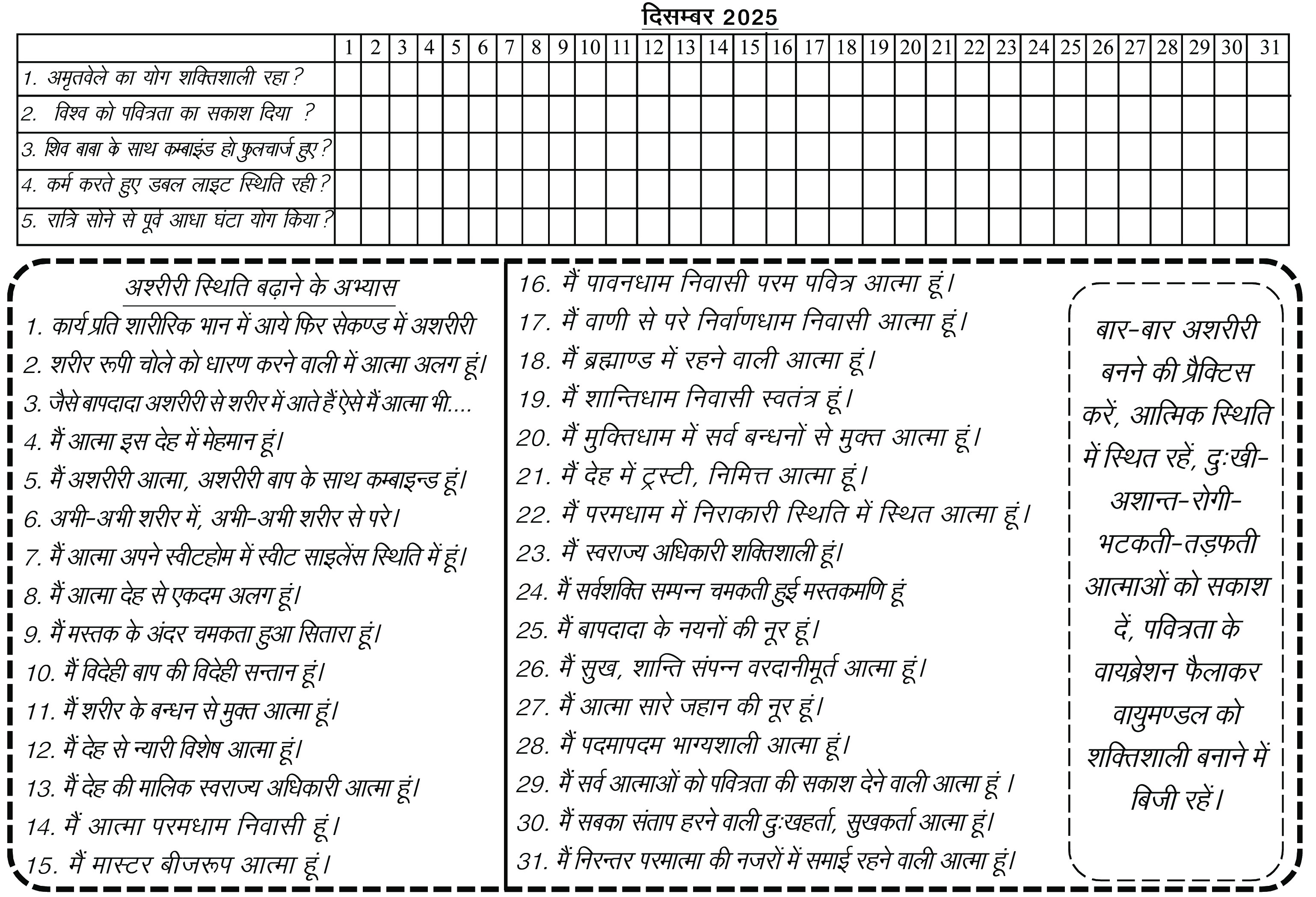 01. Daily Murli ---------------------------------------------- 011. Old Murlis - All Languages 01. Old Daily Murli - 2005-2020 ---------------------------------------------- 012. Old Daily Murli Sections 01. Murli MahaVakya 03. Murli Dharna 04. Murli Vardans 06. Murli Slogans 07. Murli Swamans 08. Murli Chart 10. Murli GYDS 11. Murli Crosswords 12. Murli Quiz 13. Murli Visual Pdf 14. Murli Poems 16. Murli Calendars 18. Today Moti 28. Murli Synopsis 30. Soul Sustenance -------------------------------------------- 013. Avyakt Murli Section-1969-24 01. Hindi 02. English 03. Tamil 04. Telugu 05. Kannada -------------------------------------------- 02. Avyakt Ishare 03. Avyakt Murli MahaVakya-Hindi 03. Avyakt Murli MahaVakya-Eng 05. Avyakt Sandesh 07. BapDada Drills 10. Madhuban Nivasi Meeting BapDada 11. Prabhu Milan - Suraj Bhai ---------------------------------------------- 014. Avyakt Murli Project 014. Avyakt Murli Project ---------------------------------------------- 015. Sakar Baba's Voice Murli 15. Sakar Voice Murli - Mp3 - 1963-1969 15A. Sakar Voice Murli - Htm - 1963-1969 ---------------------------------------------- 016. Daily Meditation 01. Daily Amritvela Meditation 02. Daily Amritvela Meditation New 03. Daily Divine Connect Meditation 04. Daily Paramdham Meditation 05. Online Meditation 07. Daily Amritvela Meditation - 2020 09. Daily Night Meditation-2020 ---------------------------------------------- 017. Rajyoga Meditation 02. Rajyoga Shibirs 04. Rajyoga Classes 05. Rajyoga Pdf 06. Rajyoga Ppt 07. Rajyoga Images 08. Rajyoga Books ---------------------------------------------- 018. Meditation Commentaries 01. Audio Meditation Commentaries 02. Video Meditation Commentaries 05. Meditation Commentaries-Pdf 06. Peaceful Reflections Guided Meditation ---------------------------------------------- 019. Meditation Music 01. Meditation Music 04. Background Music 07. Commentaries Music - Rahul Bhai ---------------------------------------------- 021. Seven days Course 03. Seven Days Course - Images 07. Seven Days Course Samadhan ---------------------------------------------- 022. Amritvela 01. Amritvela Series 02. Amritvela Pdf 04. Amritvela Books ---------------------------------------------- 023. Panch Swaroop Ka Abhyas ---------------------------------------------- 024. Char Dham 04. Char Dham Images --------------------------------------------- 025. Bhagavad Geeta 01. Bhagavad Geeta 02. Sarva Samasyaon Ka Samadhan - Geeta ---------------------------------------------- 026. Values and Education 01. Values 02. Value Education 03. Virtues 04. Self Respect 05. Baba Praise 06. Master Titles 07. Companion of God 08. 365 Days Wisdom ---------------------------------------------- 031. Classes 01. Old Classes 03. Double Foreigners Classes -2022 04. Double Foreigners Classes -2023 05. Double Foreigners Classes -2023-24 06. Double Foreigners Classes -2024-25 ---------------------------------------------- 03. Class Jan 2020 04. Class Feb 2020 05. Class March 2020 06. Class April 2020 07. Class May 2020 08. Class June 2020 09. Class July 2020 13. Class Nov 2020 14. Class Dec 2020 15. Class Jan 2021 16. Class Feb 2021 17. Class March 2021 18. Class April 2021 19. Class May 2021 20. Class June 2021 21. Class July 2021 25. Class Dec 2021 26. Class Jan 2022 26. Class Feb 2022 27. Class March 2022 28. Class April 2022 29. Class May 2022 30. Class June 2022 31. Class July 2022 33. Class Sept 2022 34. Class Oct 2022 35. Class Nov 2022 36. Class Dec 2022 37. Class Jan 2023 38. Class Feb 2023 39. Class March 2023 40. Class April 2023 41. Class May 2023 42. Class June 2023 43. Class July 2023 45. Class Sept 2023 46. Class Oct 2023 47. Class Nov 2023 48. Class Dec 2023 49. Class Jan 2024 50. Class Feb 2024 51. Class March 2024 52. Class April 2024 53. Class May 2024 53. Class June 2024 53. Class July 2024 53. Class Aug 2024 53. Class Sept 2024 53. Class Oct 2024 53. Class Nov 2024 53. Class Dec 2024 53. Class Jan 2025 53. Class Feb 2025 53. Class March 2025 ---------------------------------------------- 032. Baba Milan Classes 01. Baba Milan Dates ---------------------------------------------- 033. Bhatti Classes ---------------------------------------------- 034. Bhog Messages 034. Bhog Messages ---------------------------------------------- 035. Murli Series 01. Amritology 02. Enchanted Murli 03. Weekly Wisdom 04. Diamond Dadi 05. Avatar 06. Seeing in Being ---------------------------------------------- 036. How to use BK Gyan in Life 01. How to use BK Gyan in Life 02. Your Questions / Our Answers ---------------------------------------------- 040. Coming News - Programs 01. Coming News 02. Zoom Meetings 03. Webinars ---------------------------------------------- 041. BK Database 01. Introduction to Brahmakumari 02. BK Centers 03. BK Institutes 07. Madhuban Numbers - Call us 09. BK R and D 11. BK Stores 12. BK Services 13. Brahmakumari Help Line Nos. ---------------------------------------------- 043. Baba Portal 043. Baba Portal ---------------------------------------------- 050. Festivals and Days Indian Festivals 01. Diwali 02. Shiv Ratri 03. Holi 04. Guru Purnima 06. Janmashtami 07. Parushan Parv 08. Ganesh Chaturthi 09. Shraadhdha ---------------------------------------------- Indian and World Days 04. 14 February - Valentine Day 07. 21 June - International Yog Day 08. 15 August - Independence Day 11. 14 Nov - World Diabetes Day ---------------------------------------------- BK Remembrance Days 01. 01 Jan - Dadi Janki Birth Day 04. 11 March - Dadi Chandramani 05. 15th March - Didi Nirmal Shanta 06. 27 March Dadi - Janki Punyatithi 09. 28 July - Didi - Manmohini 10. 25 August - Prakashmani Day ---------------------------------------------- |